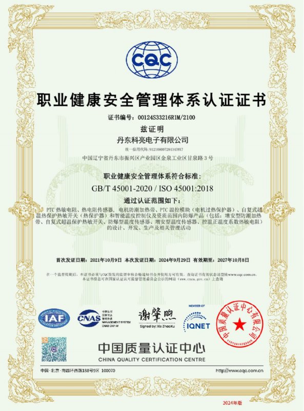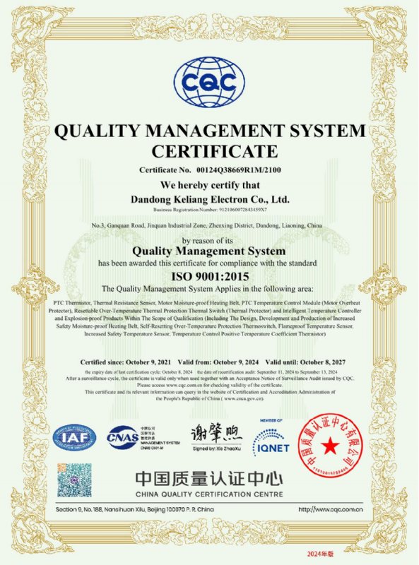 丹東科亮電子有限公司主要生產經營電機保護PTC熱敏電阻、電機防潮加熱帶、電機保護熱敏開關、電機軸承及線圈溫度數字顯示傳感器,以及與傳感器配套的智能溫度顯示儀表等產品,并可根據用戶需求,可以特殊定制。